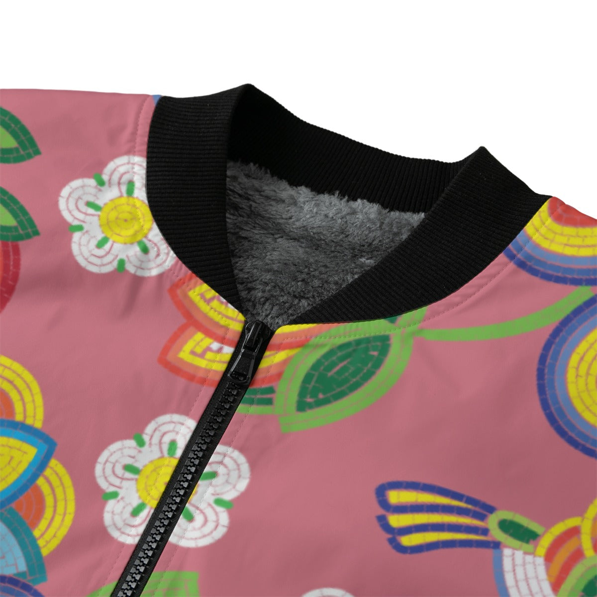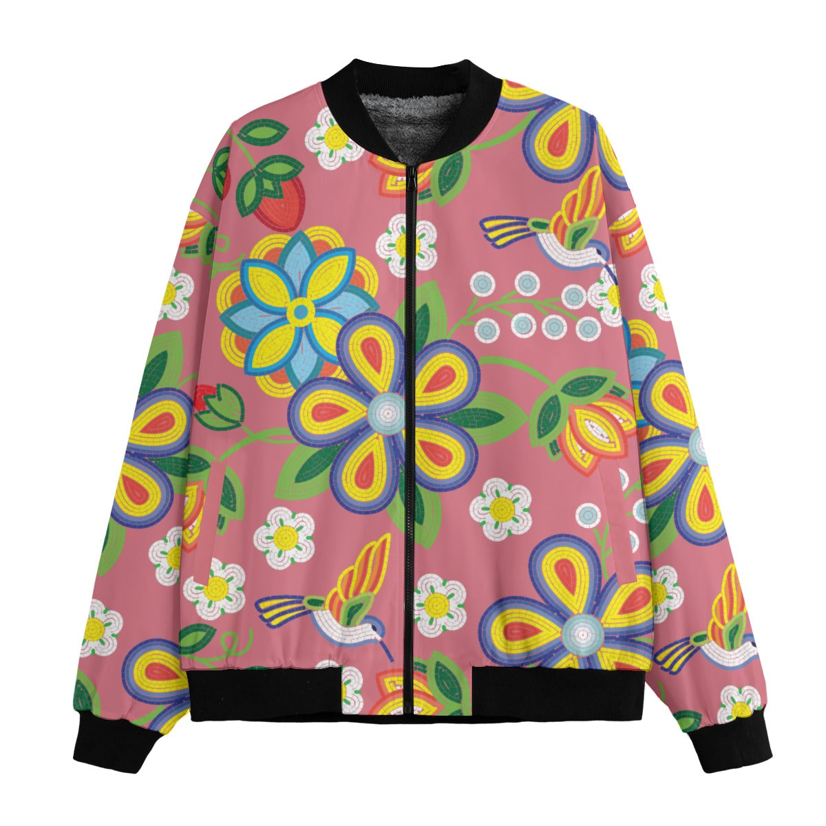 This Métis Floral Beaded Fleece Bomber Jacket is designed for both warmth and style. Featuring a cozy fleece lining and a secure zip closure, it's perfect for everyday wear. Made from 100% polyester, this jacket offers a regular fit with long sleeves, a classic crew neck, and a sleek black zipper for a polished finish.