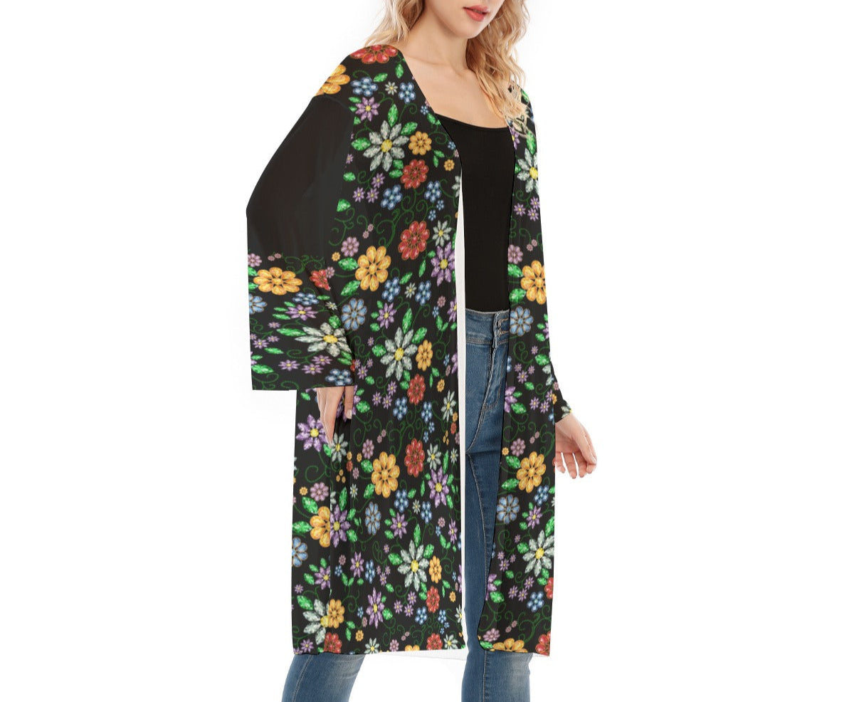 This Métis Inspired Floral Beaded Mesh Cardigan is super lightweight and breathable, thanks to its mesh material (88% polyester and 12% spandex). Its regular fit is perfect for any body type!