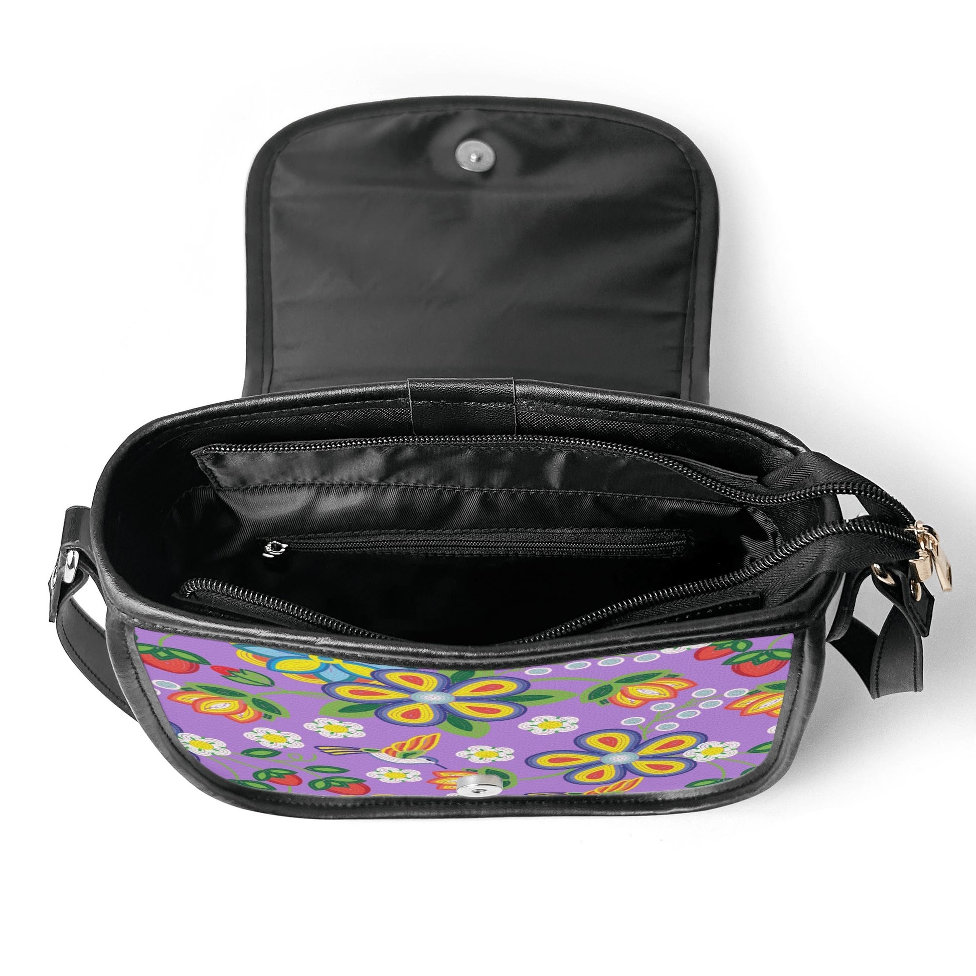 Upgrade your accessory game with the Métis Lavender Floral Beaded Saddle Bag, featuring a sleek metal clasp and secure zipper closure for added convenience. With its interior design, including a spacious compartment, zipper pocket, and two coin pockets, this bag offers ample space. Equipped with an adjustable shoulder strap, it offers flexibility for hand or shoulder carry. Whether for work or leisure, this saddle bag has functionality that's perfect for any occasion.